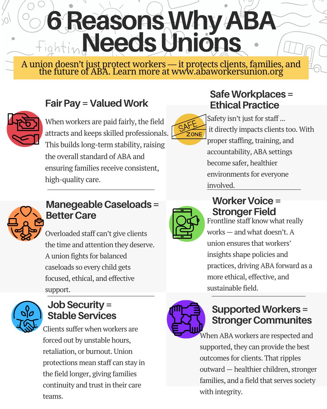 We need your help. As we continue to grow, each worker that enters the fold increases our ability to connect with more workers and build a network of resilient organizers dedicated to changing the playing field for all workers in Applied Behavior Analysis.