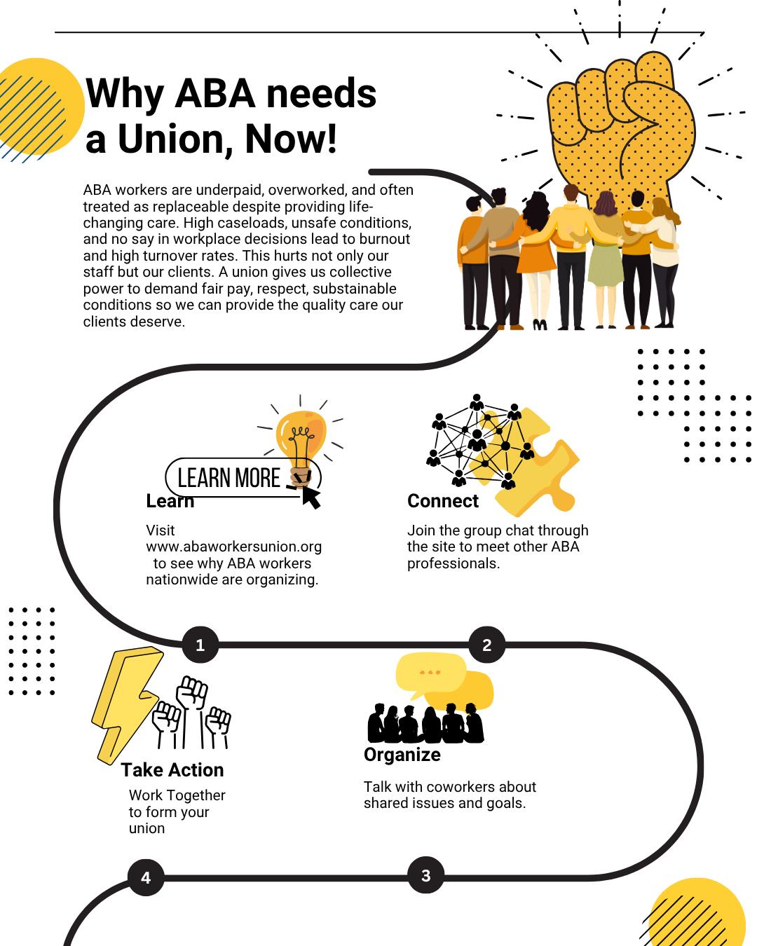We need your help. As we continue to grow, each worker that enters the fold increases our ability to connect with more workers and build a network of resilient organizers dedicated to changing the playing field for all workers in Applied Behavior Analysis.